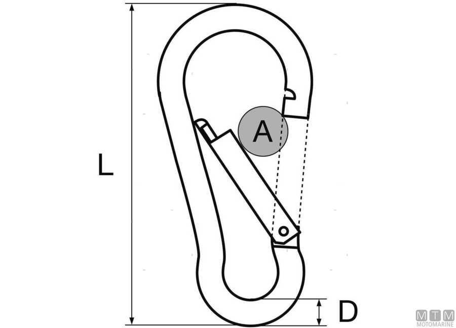 Moschettone in Acciaio Inox AISI 316 con sistema di aggancio antigrip. Non impiglia le cime.