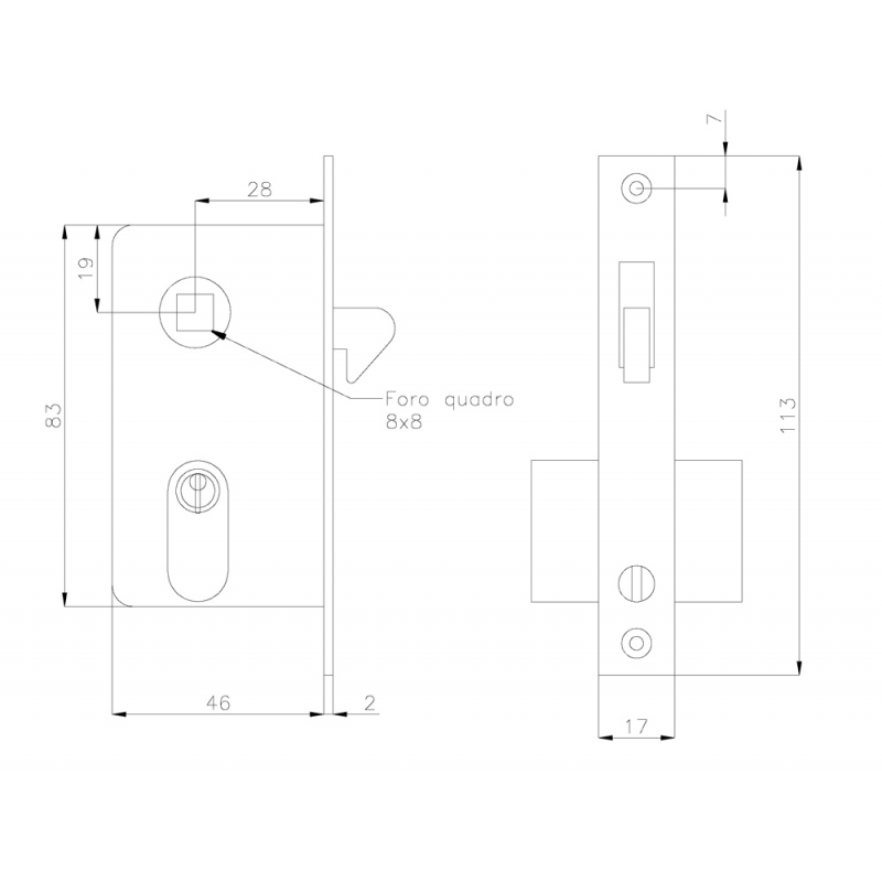 Serratura da incasso in ottone cromato con cilindro, per porte scorrevoli. Incasso mm. 83x17, quadro mm. 8.