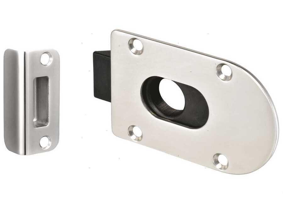 Chiusura a incasso in Acciaio Inox AISI316 per portelli e paglioli. Con meccanismo a molla che può essere aperto dall'esterno e dall'interno. Dim. 56x91 mm