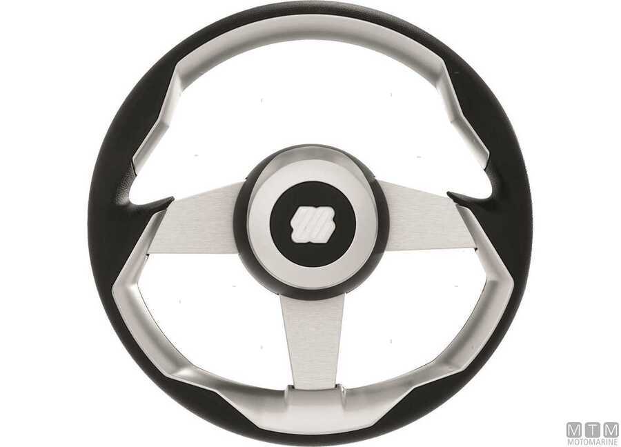 Volante con telaio in Alluminio Anodizzato e impugnatura morbida in Poliuretano con inserti Silver. Certificato CE-ISO23411 e conforme ABYC. Completo di tappo centrale e mozzo con cono standard da 3/4".